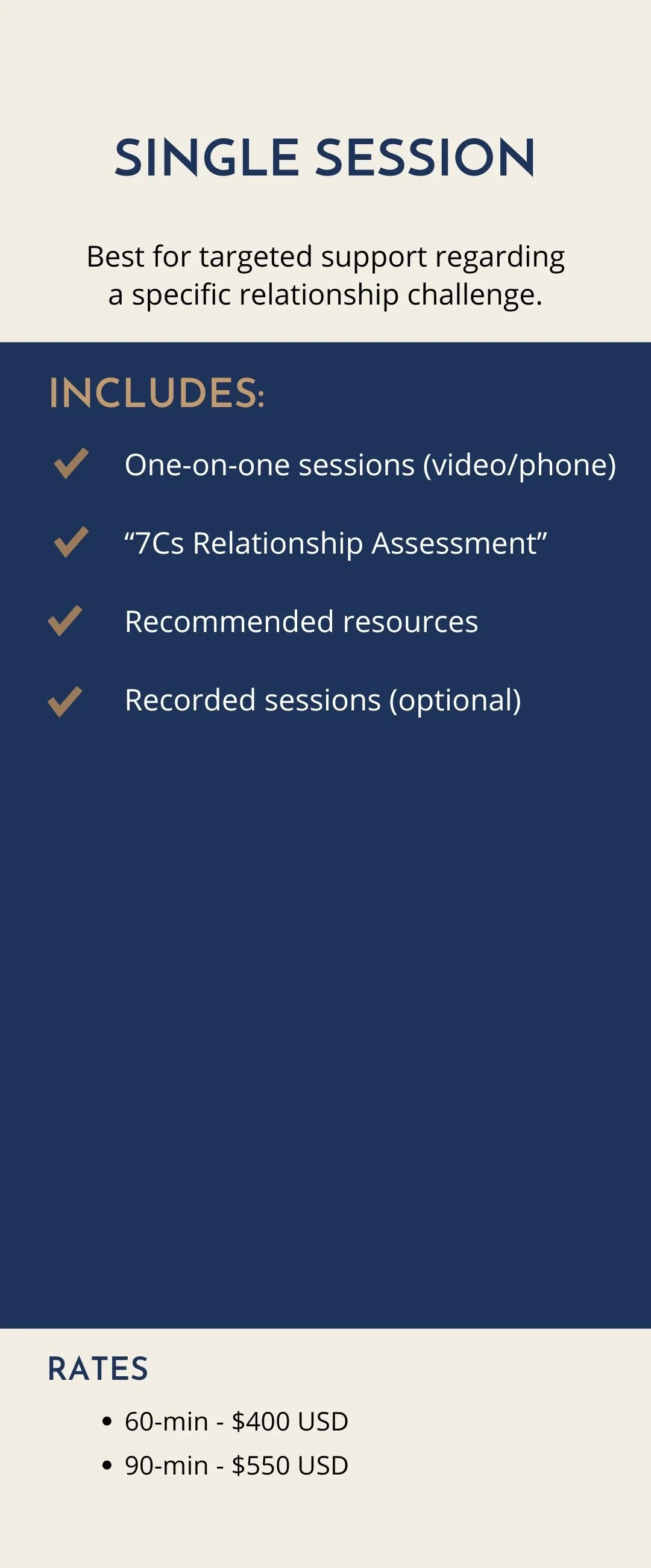 And with my signature 7Cs Relationship Assessment, I help my clients make sense of their relationship challenges. Through this objective analysis, my clients are able to better come to terms with the limitations of their relationships or evaluate whether these areas can be worked on.