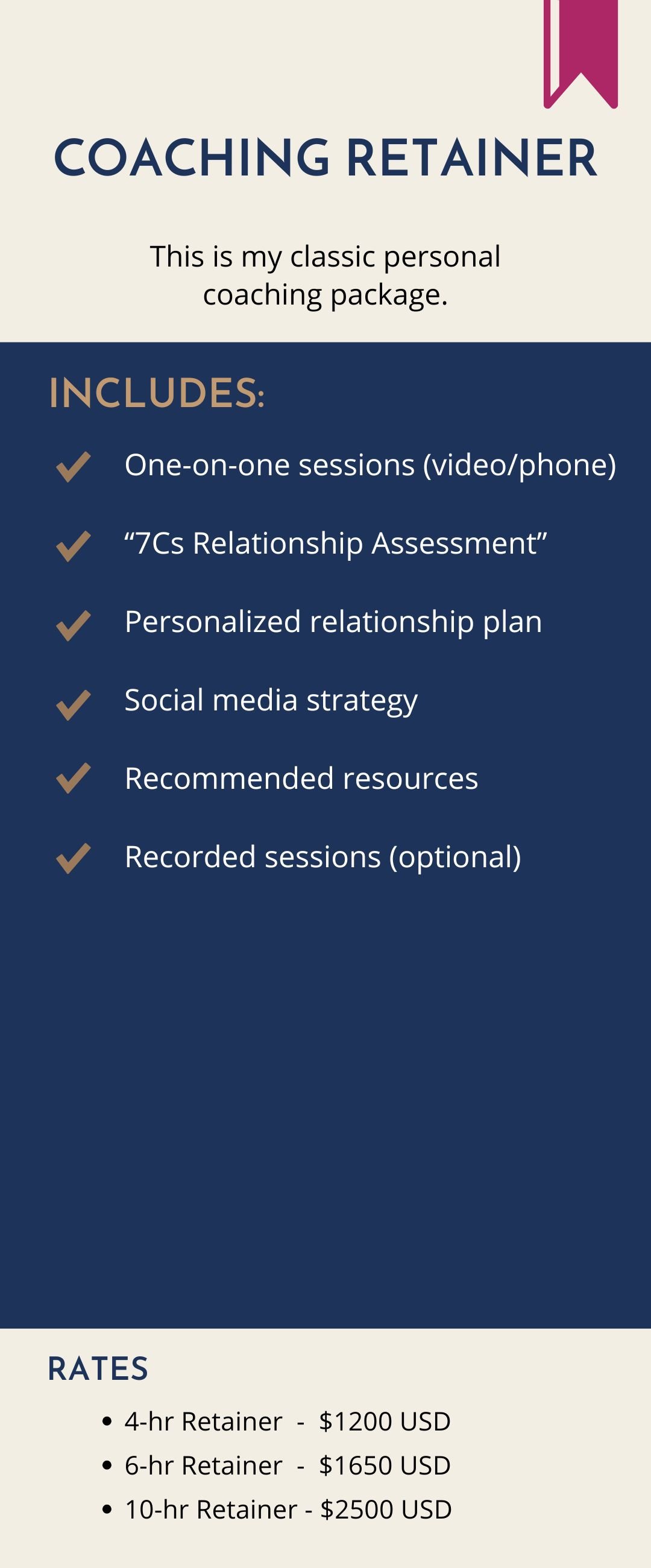 Once we decide to work together, I’ll do an in-depth analysis of your relationship history and current situation using my 7 Cs Assessment, we’ll identify your core objectives, and create a personalized “Lovistics Plan.” I’ll also recommend resources (books, articles, etc.) based on your unique situation and needs.